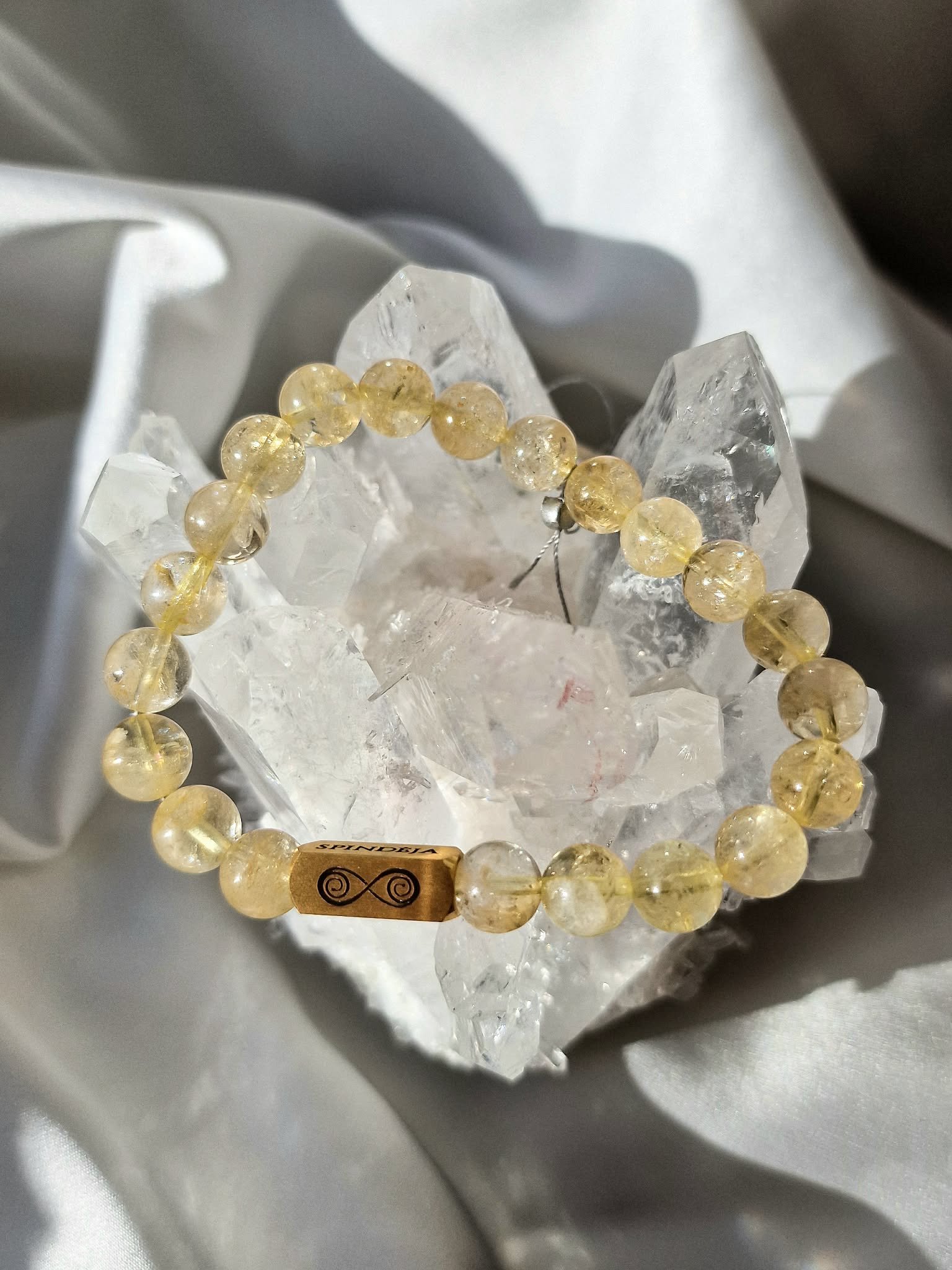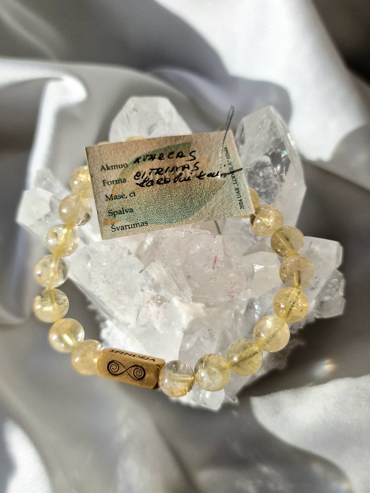 Citrino apyrankė su paauksuoto nerūdijančio plieno „Spindėjos“ logotipo intarpu.