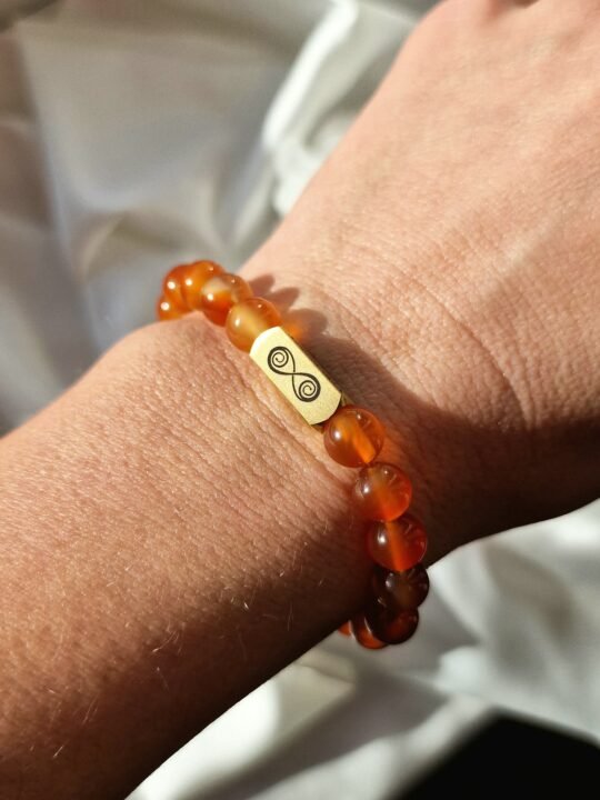 Karneolio apyrankė su nerūdijančio plieno „Spindėjos“ logotipo intarpu.